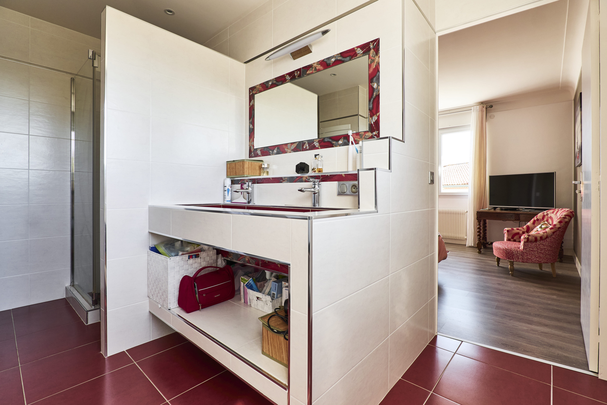 À l’étage, un large palier dessert un séjour lumineux de plus de 50 m2 avec VUE MER et accès à une belle terrasse. Vous y trouverez également une cuisine indépendante aménagée et équipée, une suite parentale de 22 m2 avec vue mer et sa salle d’eau avec douche à l’italienne et WC privé, ainsi qu'une chambre supplémentaire, une seconde salle d’eau et un WC indépendant.