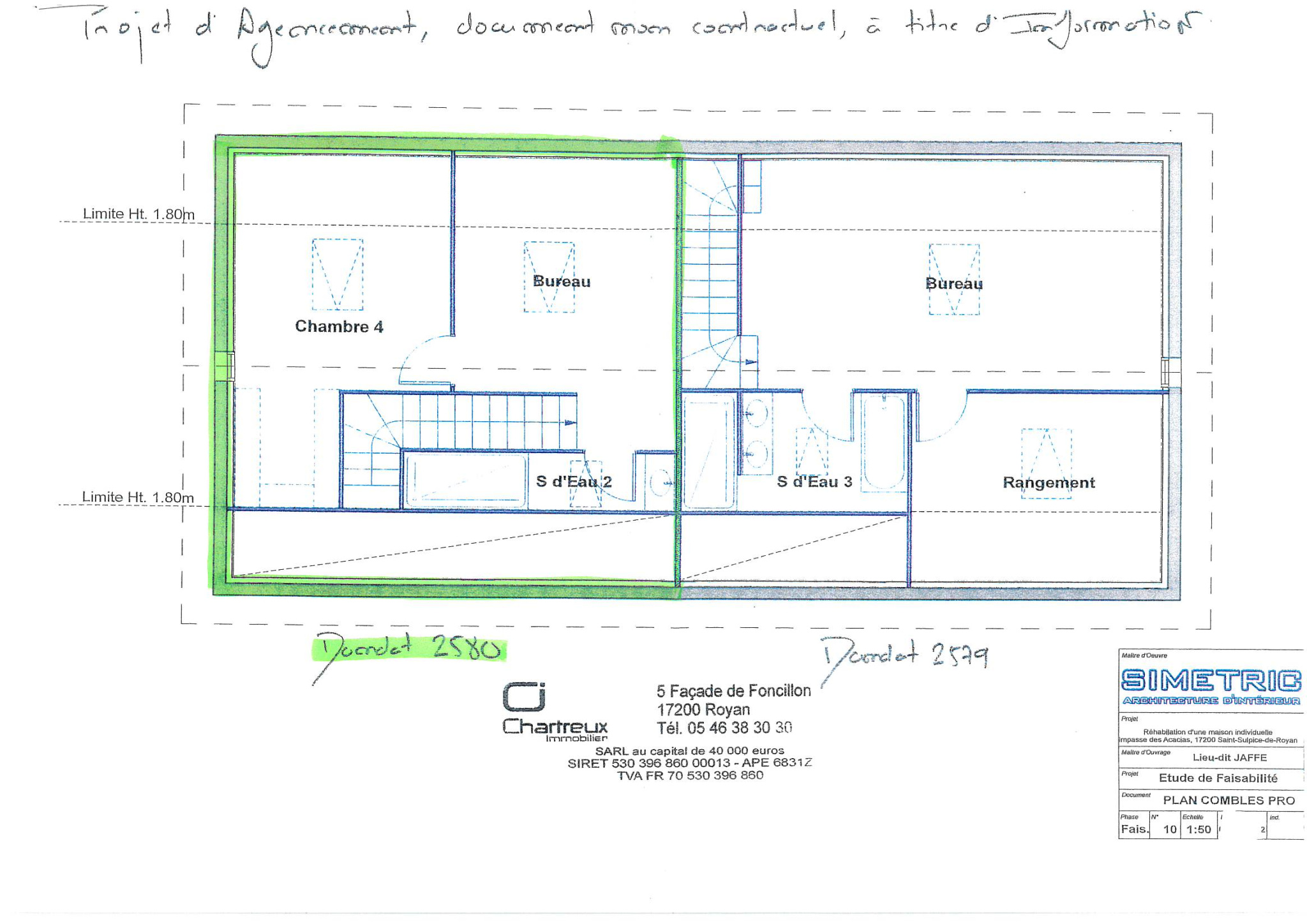 Au second étage mansardé : palier / bureau, chambre, salle d'eau.